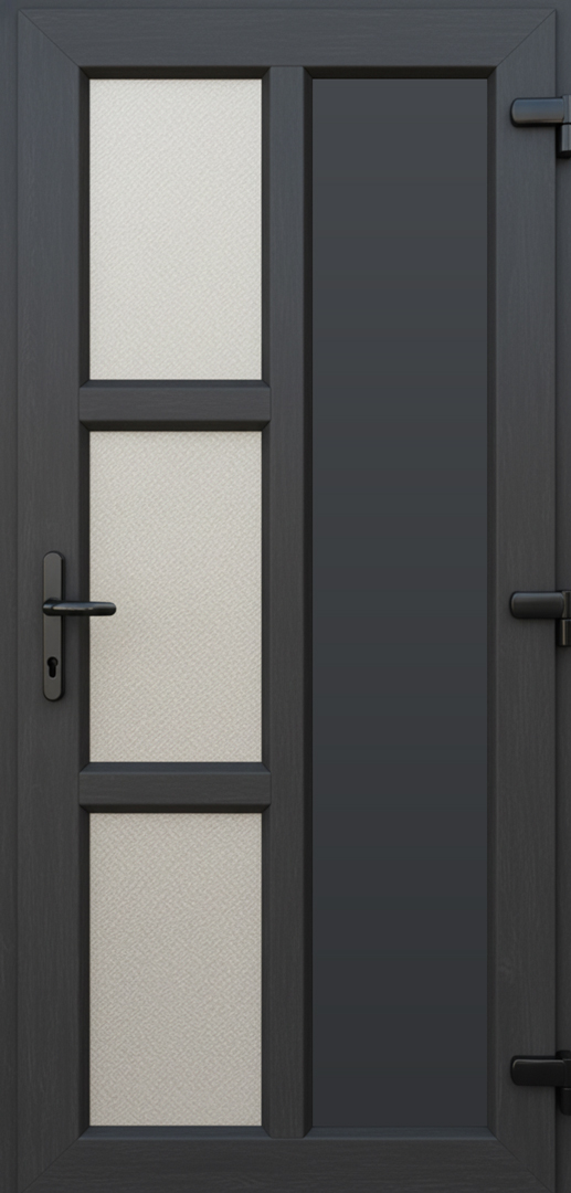 Vyberte si stranu otvárania (ľavé/pravé) a požadovaný rozmer v rozbaľovacom menu nad cenou a doprajte svojmu vchodu kvalitné plastové vchodové dvere Vertical 3Glass antracit z zzshop.sk.